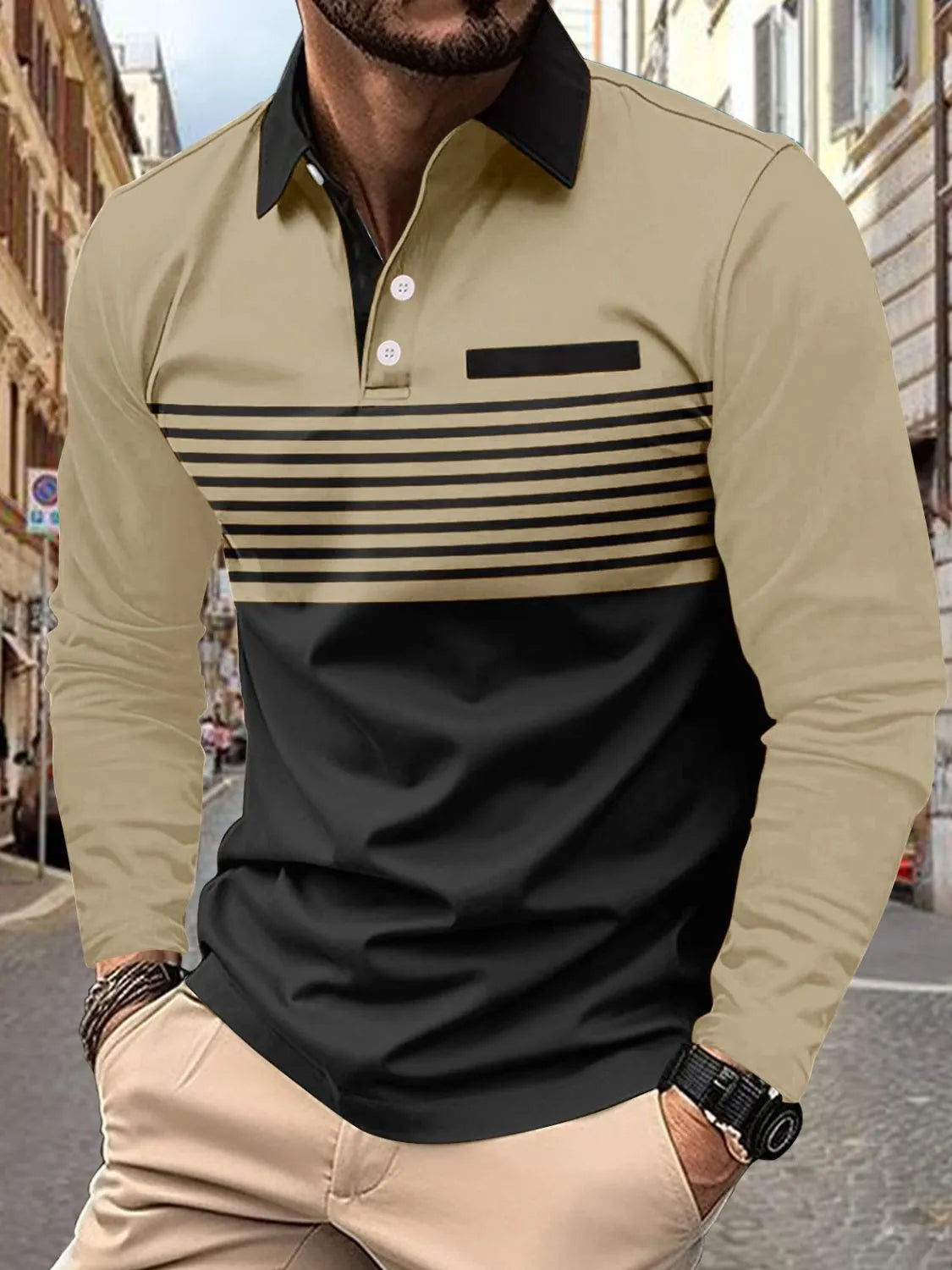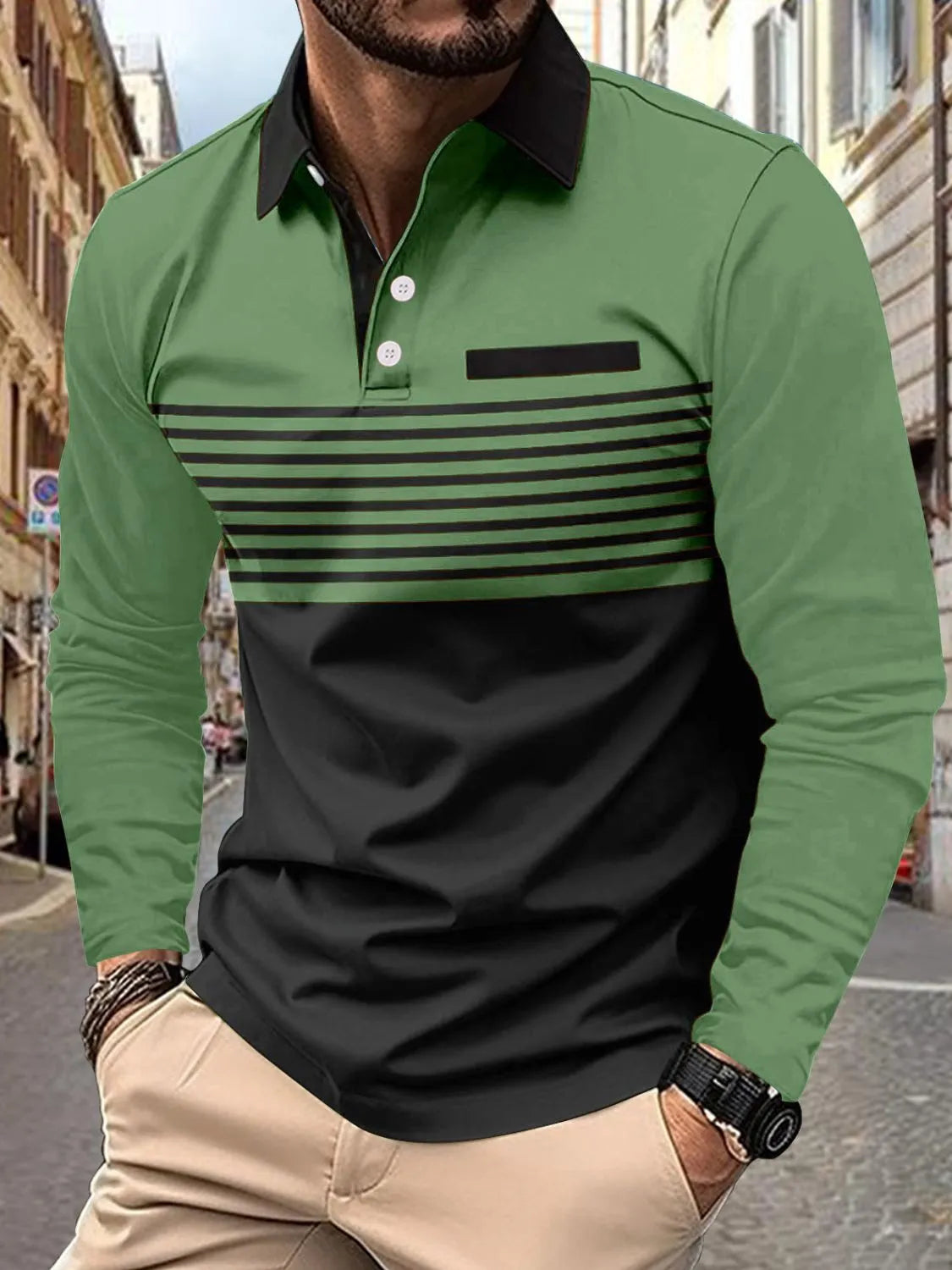 Home/All/Men's Full Size Collared Neck Long Sleeve Striped Polo Plus Size