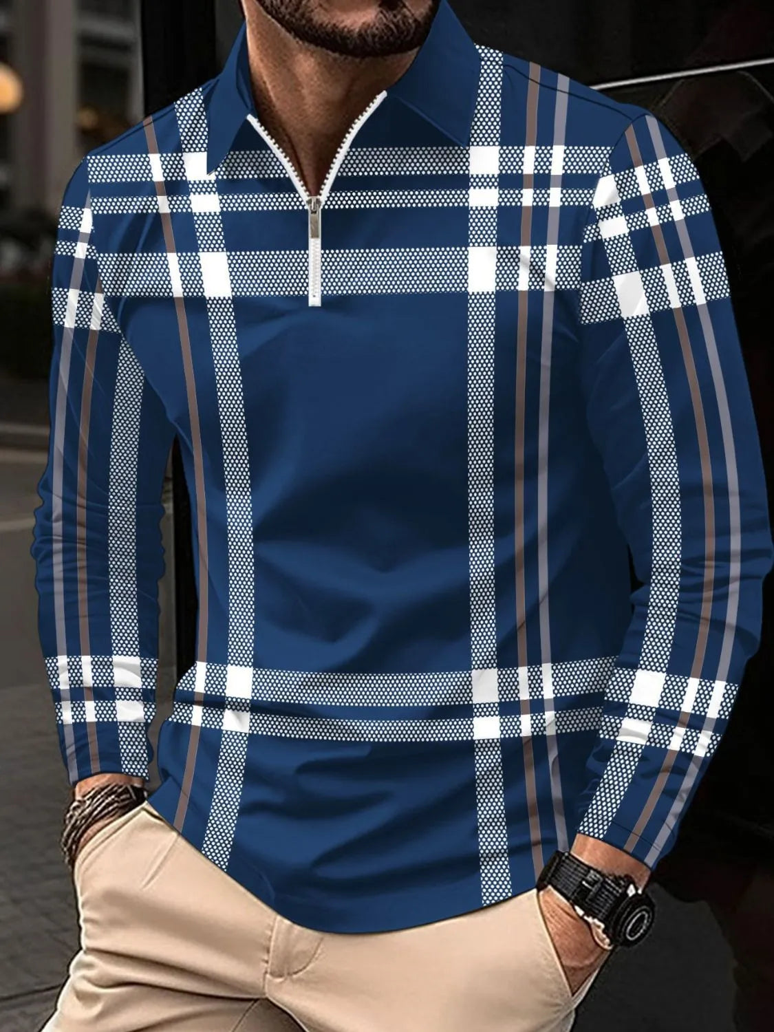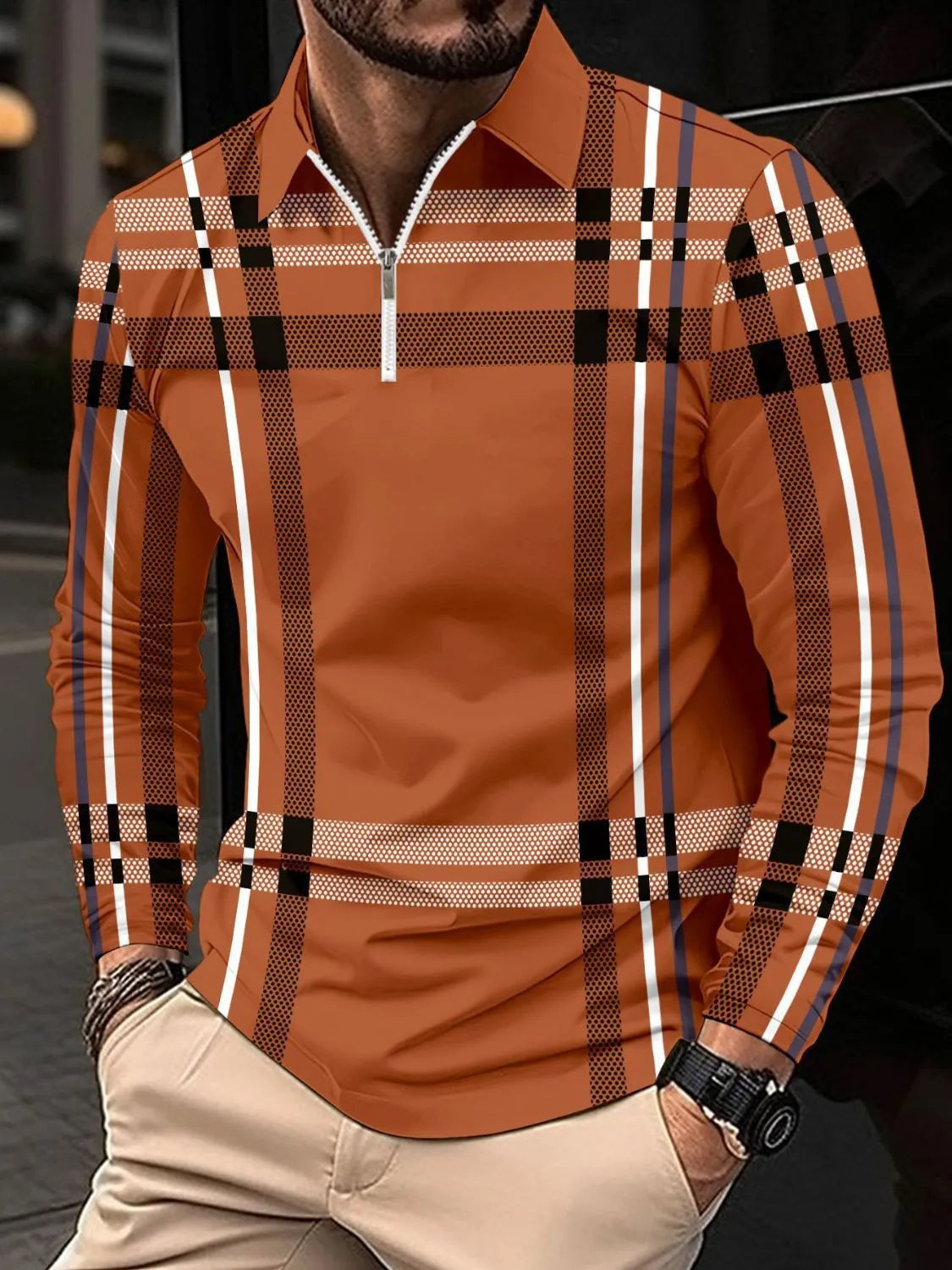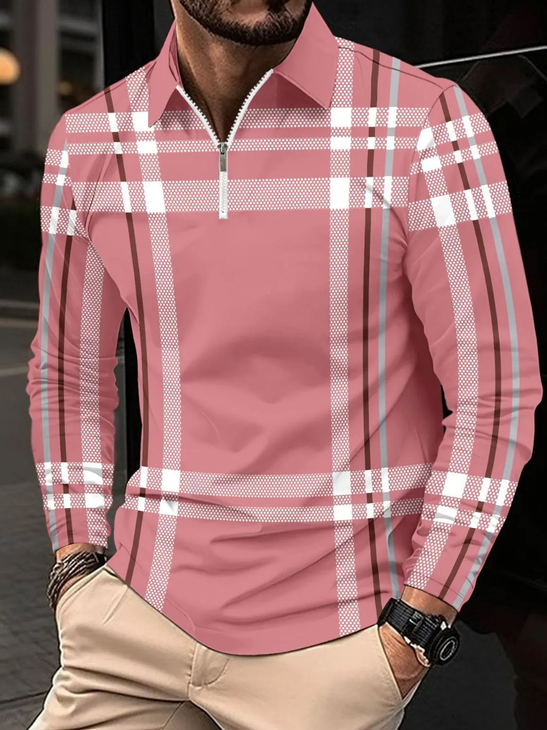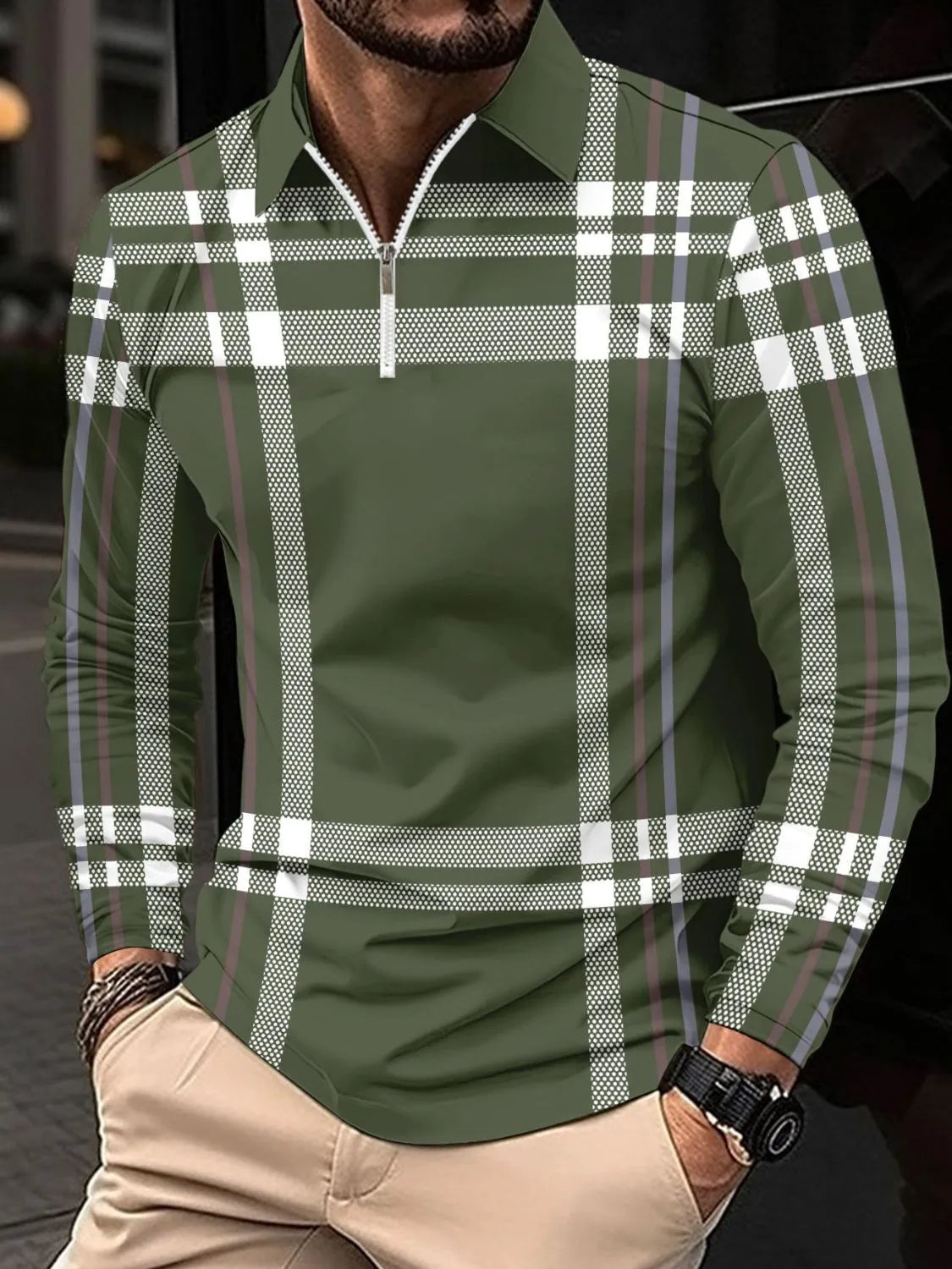 Men's Full Size Plaid Zip Collar Long Sleeve Polo Plus Size
