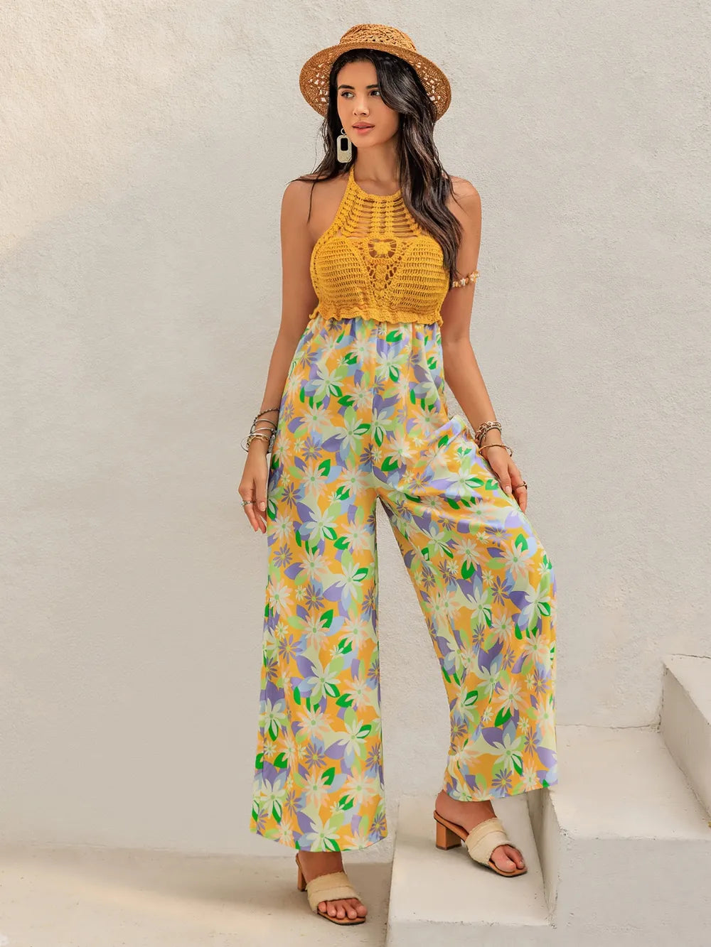 Openwork Halter Neck Floral Wide Leg Jumpsuit