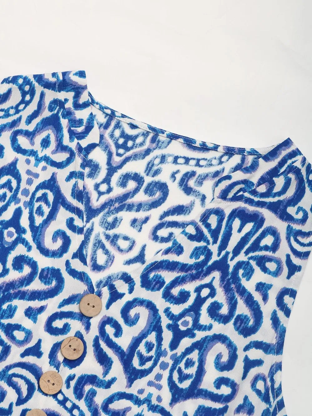 Perfee Decorative Button Printed Notched Sleeveless Midi Dress