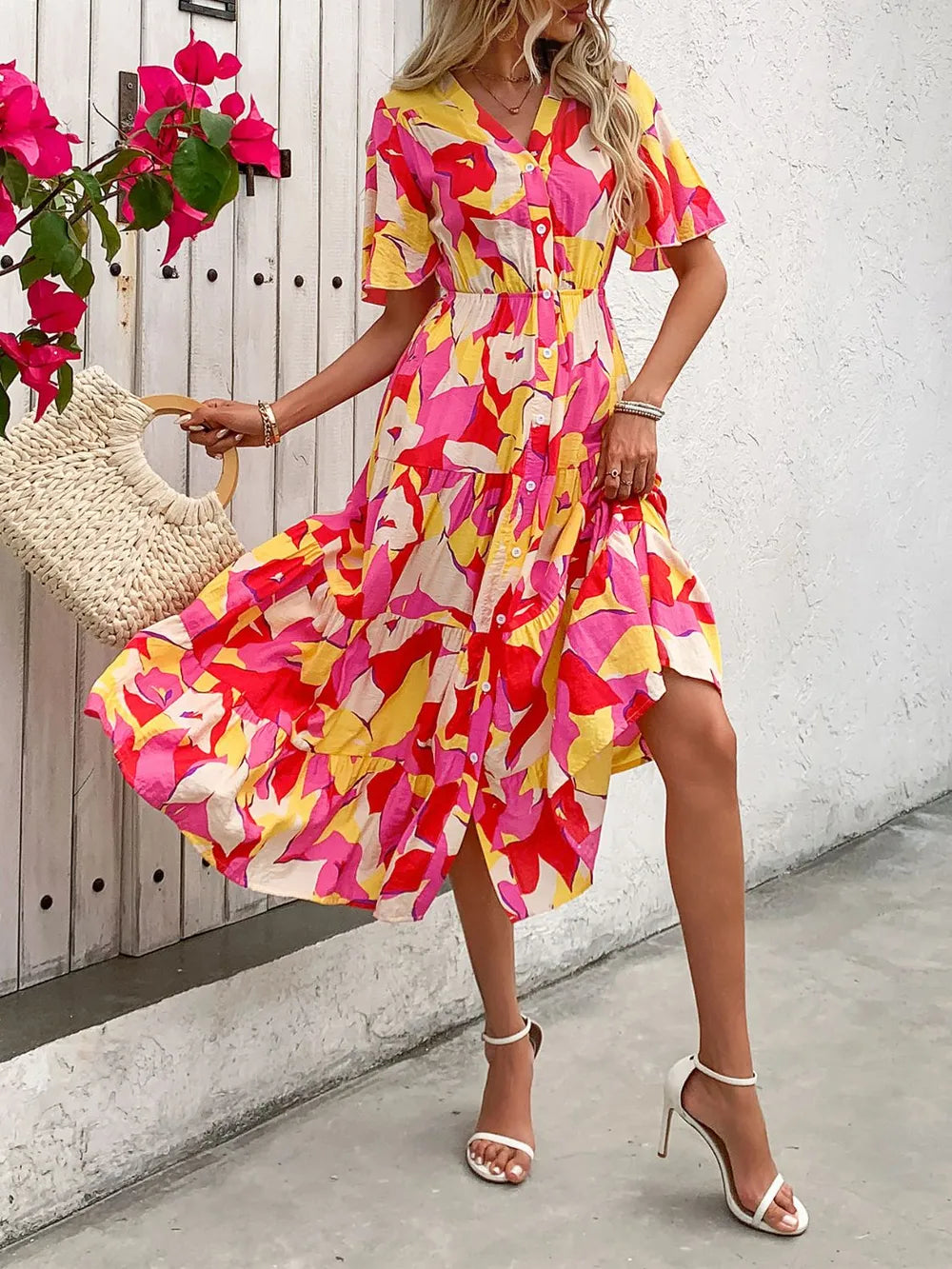 Perfee Printed V-Neck Flutter Sleeve Midi Dress