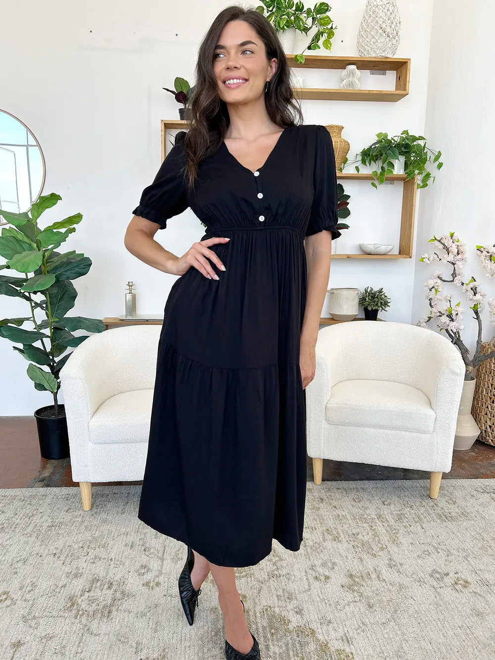 Home/All/Perfee Ruched V-Neck Half Sleeve Midi Dress