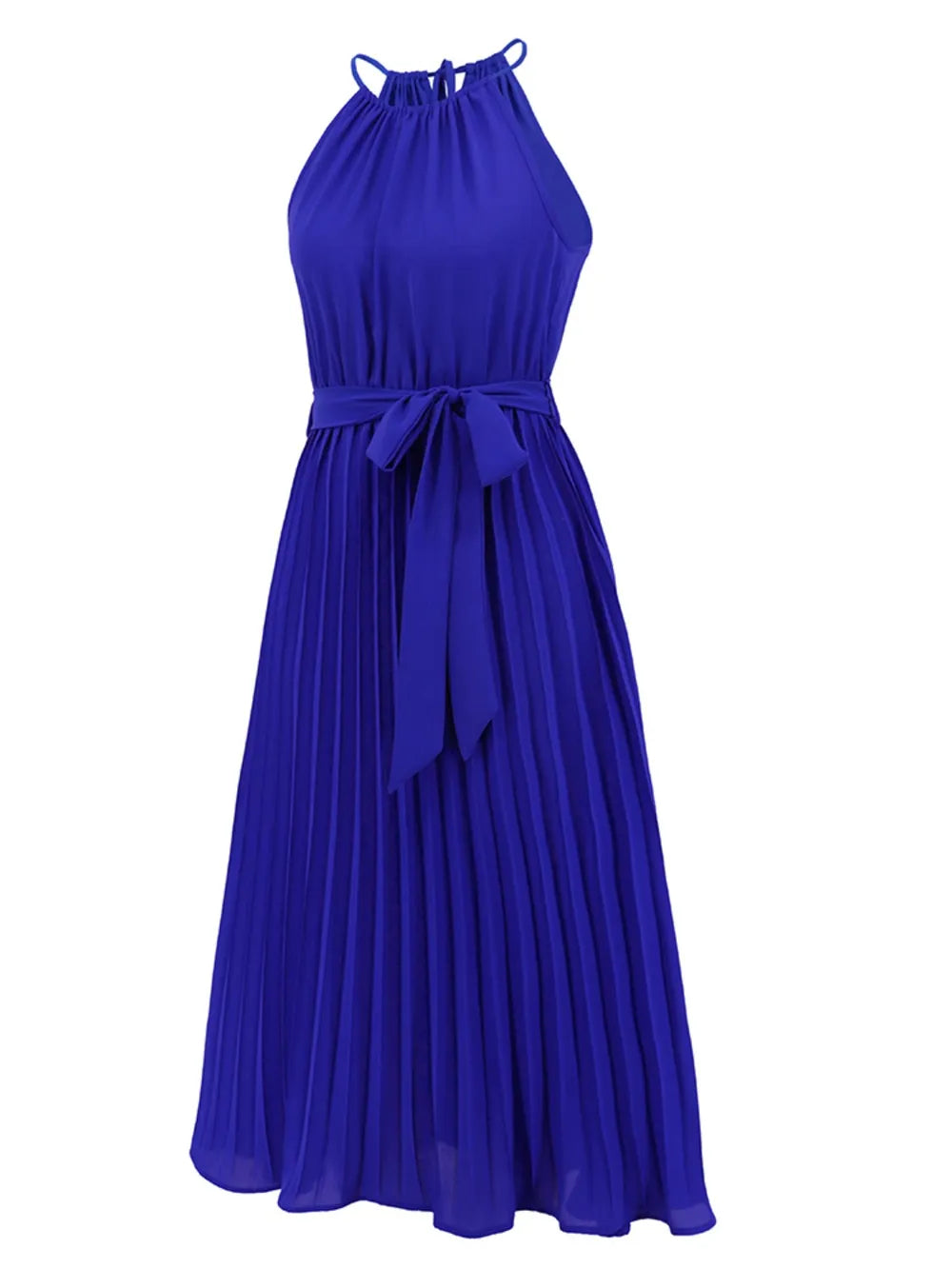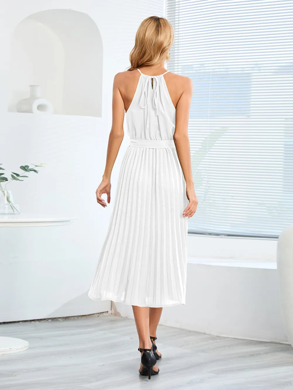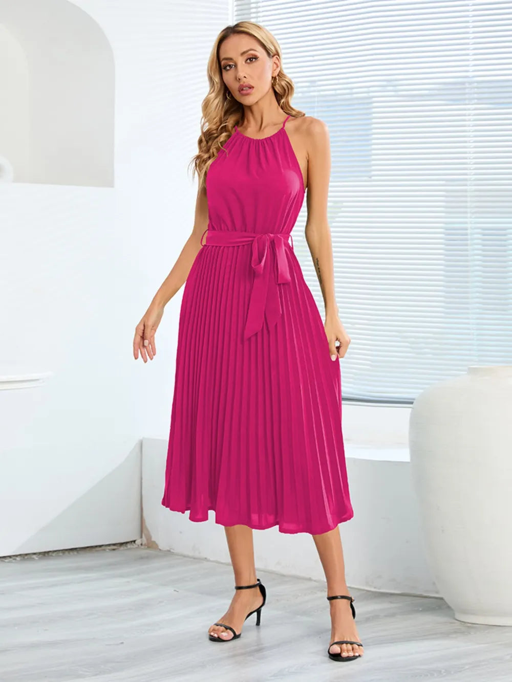 Pleated Spaghetti Strap Tie Waist Midi Dress