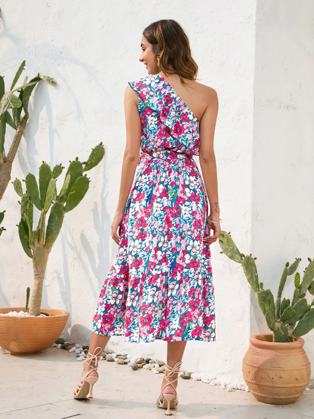 Home/All/Ruffled Printed One Shoulder Midi Dress