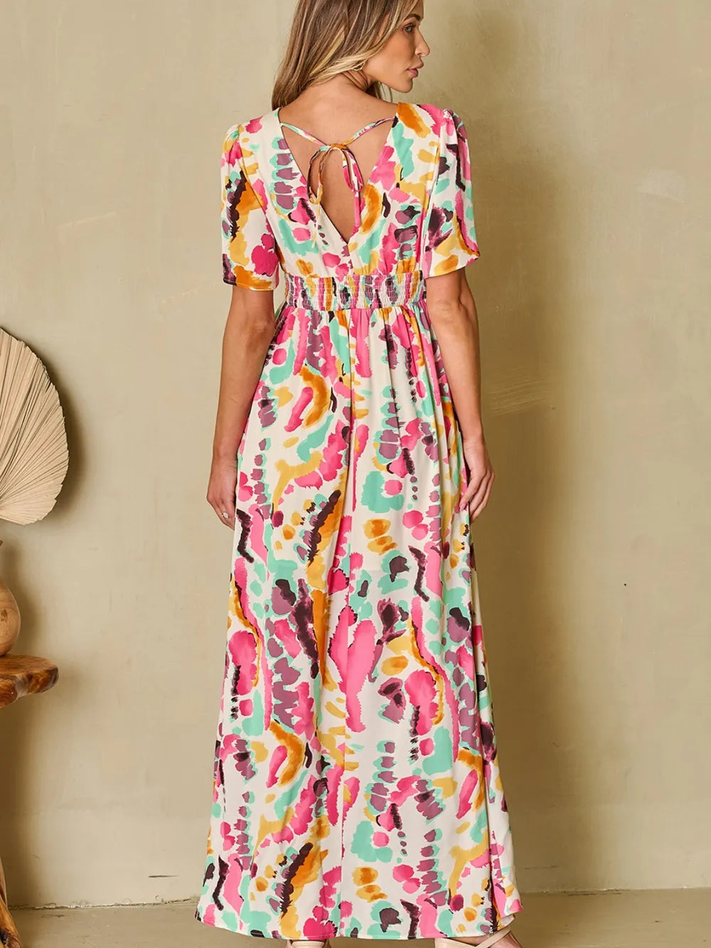 Slit Printed Surplice Short Sleeve Maxi Dress