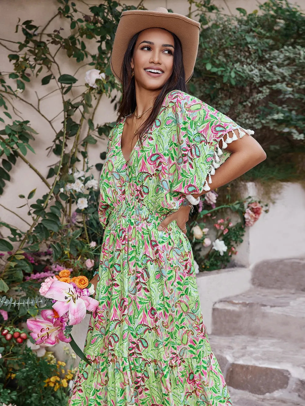 Smocked Floral V-Neck Short Sleeve Dress