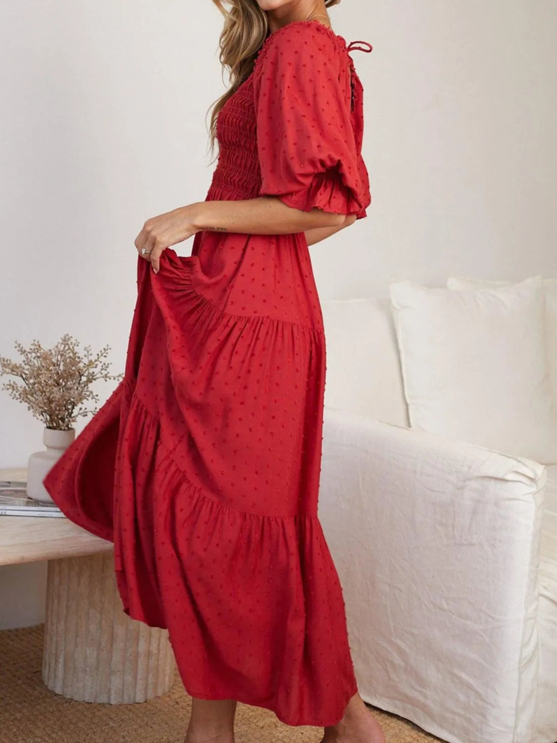 Smocked Swiss Dot Square Neck Flounce Sleeve Dress