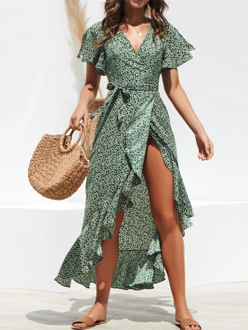 Tied Ruffled Printed Short Sleeve Midi Wrap Dress