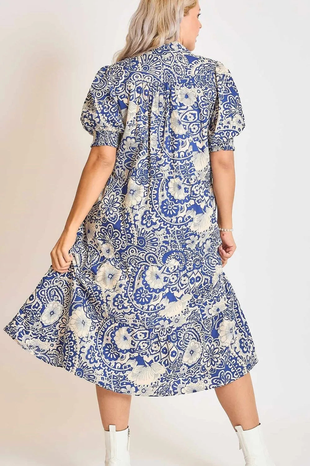 Umgee Full Size Printed Smocked Cuff Puff Sleeve Midi Dress Plus Size