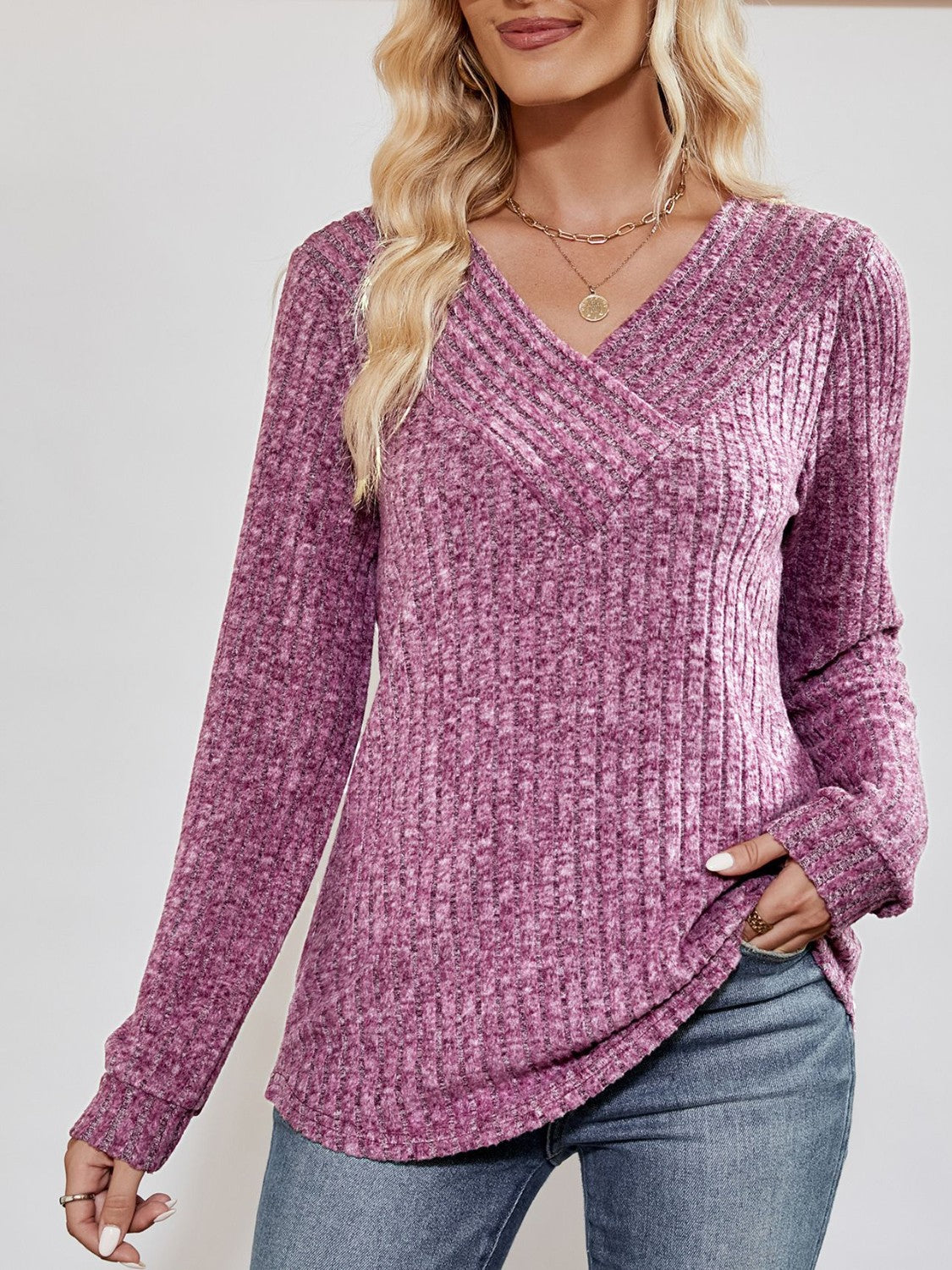 Home/All/V-Neck Ribbed Long Sleeve Top